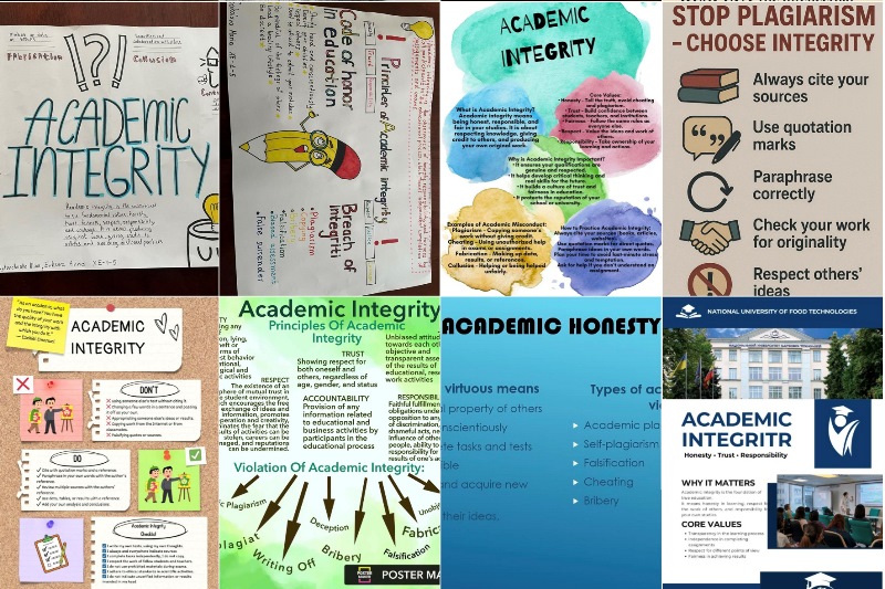 Ось тому під час перших занять у навчальному семестрі викладачі кафедри іноземних мов професійного спрямування не лише знайомлять студентів з основними пунктами «Положення забезпечення академічної доброчесності у Національному університеті харчових технологій», але й залучають їх до творчих завдань, пов’язаних і поняттями «академічна доброчесність», «плагіат», «академічна культура», «академічні цінності», «добросовісність у навчанні й науковій діяльності».