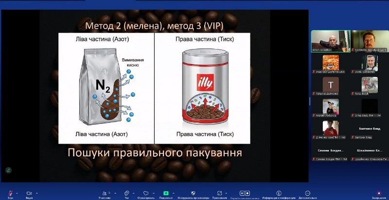 Відзначили важливість використання в упаковці інженерного рішення – одностороннього клапана дегазації, який випускає CO₂, але не впускає O₂, запобігаючи здуттю пакета й окисленню ліпідів. Лектор також показав роль азотування та модифікованої атмосфери, які преміальні бренди застосовують для стабілізації смаку й подовження терміну зберігання продукту.