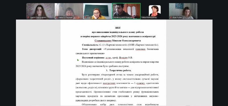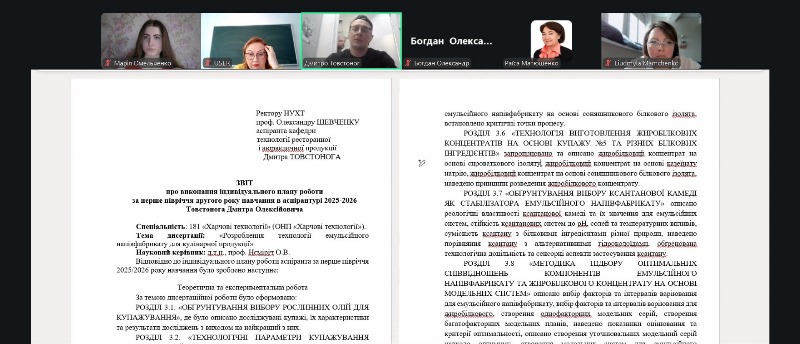На кафедрі технології ресторанної і аюрведичної продукції відбулося звітування аспірантів першого року навчання Марії Омельченко, Олександра Богдана, Максима Гребенюка, Богдана Бондаря, Юрія Клягіна, Данила Гусєва, Миколи Станжицького щодо виконання індивідуального плану роботи за перше півріччя 2025-2026 навчального року. Також про результати науково-дослідної діяльності прозвітував аспірант другого року навчання Дмитро Товстоног.