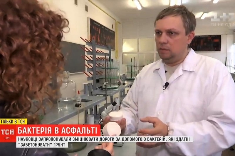 Нещодавно журналісти телеканалу 1+1 завітали на кафедру біотехнології і мікробіології НУХТ із метою підготовки сюжету щодо можливості реалізації в Україні наукових доробок вітчизняних учених у галузі біоцементації. Інтерв’ю на дану тему дав доктор технічних наук, доцент кафедри Віктор Стабніков. Ним був розроблений і протестований у пілотному виробництві біоцемент за використання уреазо-продукуючих бактерій Bacillus sp. VS1 та Yaniella sp. VS8 та оптимізовано середовище для промислового виробництва біоцементу.