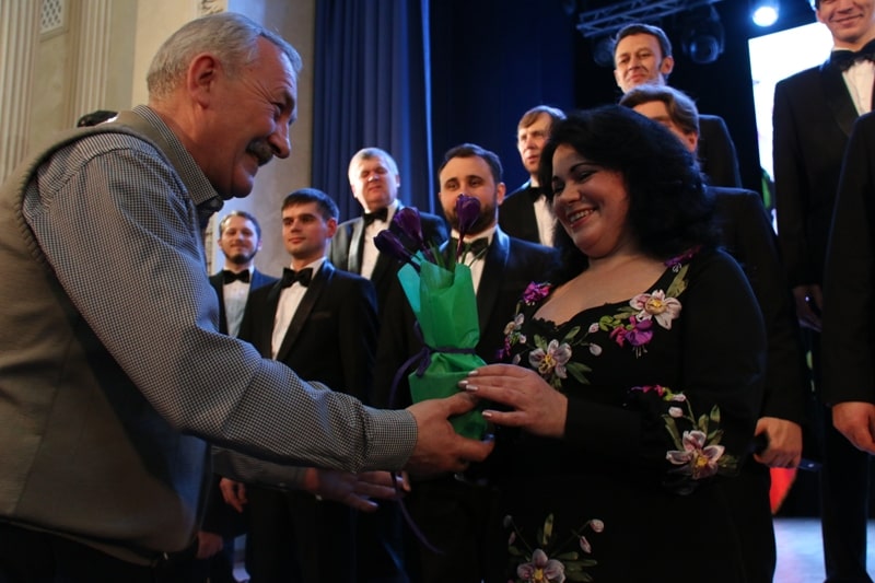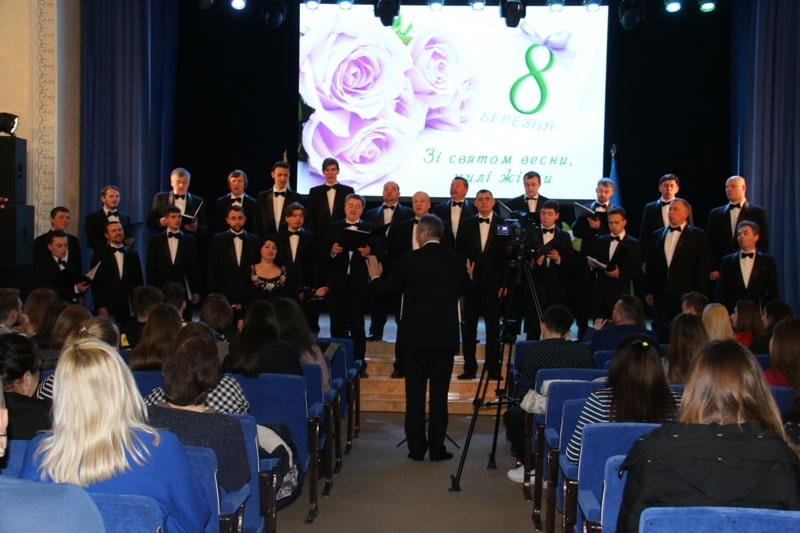 А далі наше жіноцтво отримало розкішний подарунок – виступ чоловічої хорової капели ім. Л. Ревуцького та творчої молоді нашого університету. Звучали сучасні й народні українські пісні – «Ніч яка місячна», «Гуцулка Ксеня», «Співай, гітаро», «Ой, куди ти їдеш, Євтуше?», «Із сиром пироги», «Чорні очка, як терен», «Ти мене підманула», «Їхав козак за Дунай», «Любов останньою ніколи не буває», «Запали», «Сила», «Намалюй», «Прірва», «Сон», «Небо плаче», «Ча ча ча царівна», «Ти – та, якою живу». Долучилася до вітань і онука однієї з наших співробітниць – маленька балерина Тетянка подарувала чарівний танець. Завершився концерт піснею «Шануймо жінку», яку виконали студент факультету готельно-ресторанного та туристичного бізнесу Ілля Гетьман, студент факультету біотехнології та екологічного контролю Ілля Фішер і аспірант Євген Амаріца.