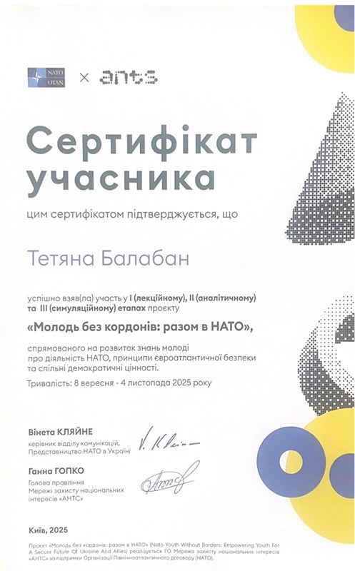 Четвертокурсниця освітньої програми «Менеджмент» Навчально-наукового інституту і управління Тетяна Балабан взяла участь у освітній програмі «Молодь без кордонів: разом у НАТО» (Nato Youth Without Borders: Empowering Youth For A Secure Future Of Ukraine And Allies). Цей проєкт реалізується ГО «Мережа захисту національних інтересів «АНТС» за підтримки Організації Північноатлантичного договору (НАТО).