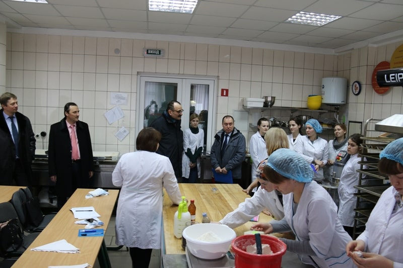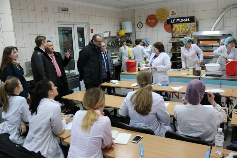 Також у рамках візиту до нашого вишу Максим Стріха і Дмитро Чеберкус завітали на лабораторне заняття на кафедру технології хлібопекарських і кондитерських виробів. У навчально-науковій лабораторії кафедри, обладнаній партнером університету, фінською компанією «Лейпурін», студенти саме опановували технології виготовлення хлібобулочних виробів.