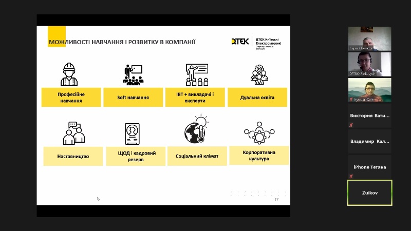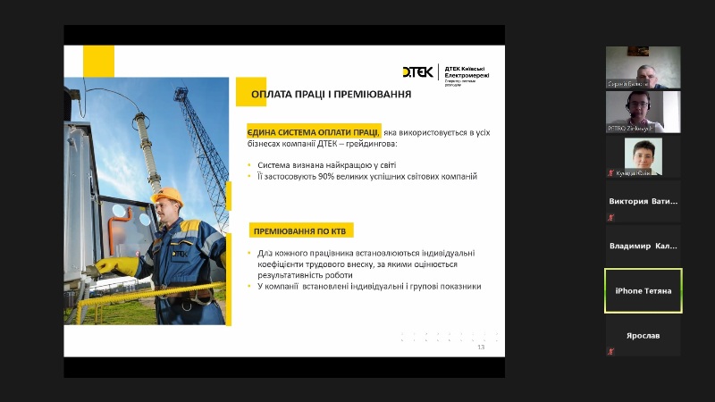 До здобувачів вищої освіти 2-4 курсів спеціальності 141 «Електроенергетика, електротехніка та електромеханіка» завітали головна фахівчиня центру професійного навчання ПрАТ «ДТЕК Київські електромережі» Тетяна Тростянець і фахівець центру професійного навчання Володимир Калашніков. До зустрічі, що відбулася у форматі zoom-конференції, долучилися завідувач кафедри електропостачання та енергоменеджменту Навчально-наукового інженерно-технічного інституту ім. акад. І.С.Гулого Сергій Балюта, доцентка Юлія Куєвда та асистент Петро Зінькевич.