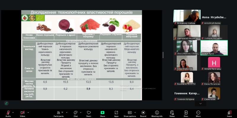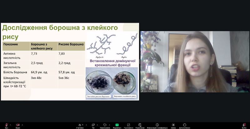 Здобувачі освіти представили результати досліджень щодо розроблення технологій різних видів органічного печива з цільнозернового борошна з додаванням продуктів перероблення грибів, порошків сушених фруктів та ягід, дієтичного печива з борошна клейкого рису, кнедликів тощо. Особлива увага приділялася відповідності якості сировини та технологій стандартам органічного виробництва, застосуванню технологічних режимів, які сприяють максимальному збереженню усіх цінних компонентів готового виробу.
