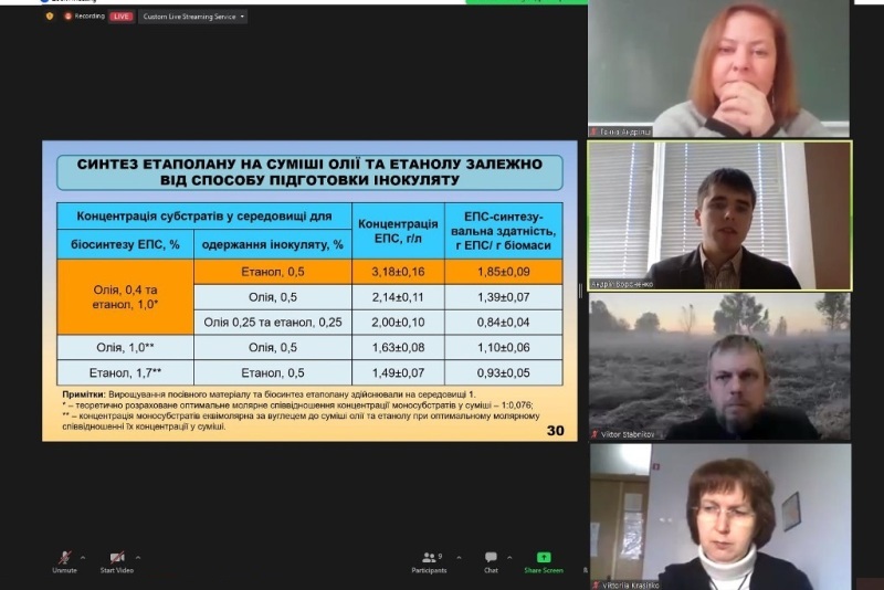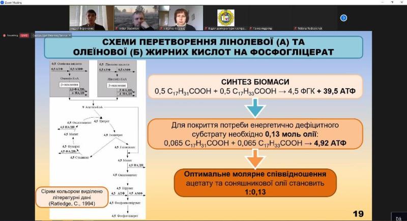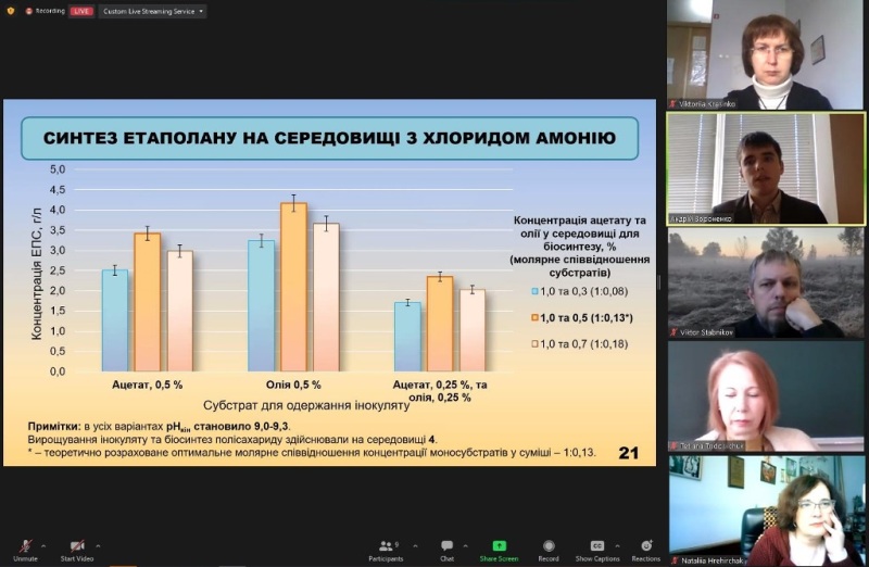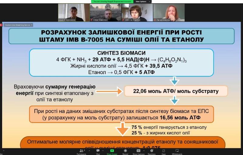 Для досягнення поставленої мети здобувачем під час захисту були представлені результати теоретичних та експериментальних досліджень особливостей синтезу етаполану на суміші енергетично нерівноцінних (олія та ацетат, олія та меляса) та енергетично надлишкових (олія та етанол) субстратів, а також продемонстровано можливість успішної заміни рафінованої соняшникової олії у змішаних субстратах на значно дешевшу відпрацьовану олію. Встановлено умови культивування продуцента на досліджуваних змішаних ростових субстратах, при яких концентрація етаполану була найвищою і досягала 16-18 г/л.