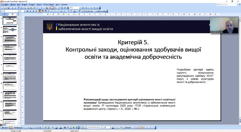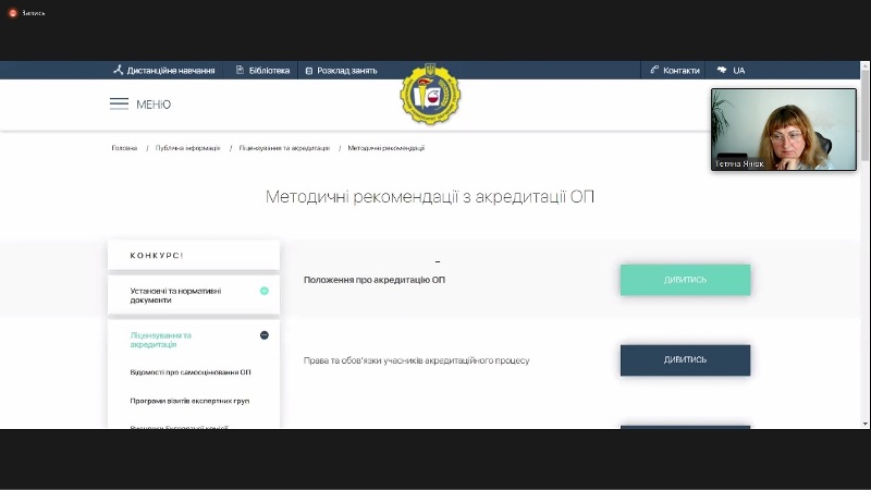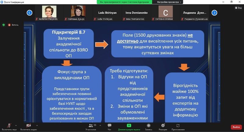 Спікери підготували для розгляду і обговорення критичні моменти в межах критерію та підкритеріїв, основні проблемні питання та помилки, які виникали на етапі формування відомостей самооцінювання, завантаження в систему акредитації, підготовки відповідей на запит експертної групи НАЗЯВО, підготовки фокус-груп і спілкування з експертами, подальшого проходження акредитаційної справи, реагування на рекомендації та зауваження експертної групи, Галузевої експертної ради (ГЕР) та НАЗЯВО, їх виконання.