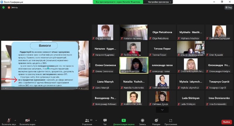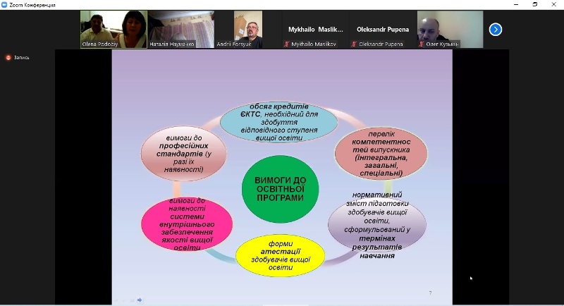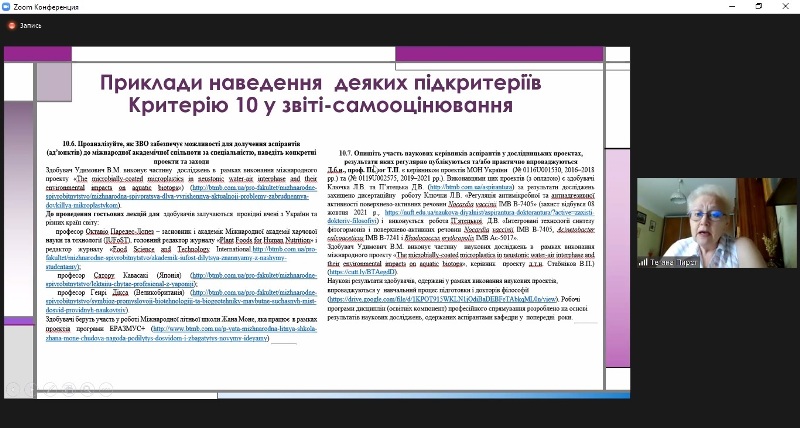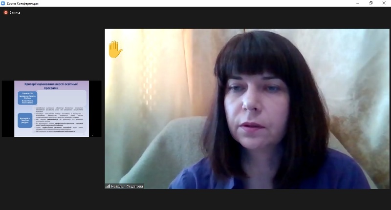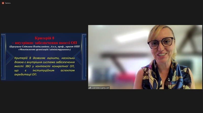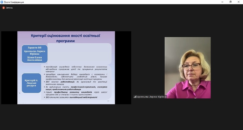 Далі детально розбирали всі критерії і підкритерії оцінювання експертами НАЗЯВО освітньо-професійних програм. Своїм досвідом і лайфхаками охоче ділилися: по критерію 1 «Проєктування та цілі освітньої програми» Юлія Камбулова і Андрій Форсюк, по критерію 2 «Структура та зміст освітньої програми» Лариса Арсеньєва і Тетяна Янюк, по критерію 3 «Доступ до освітньої програми та визнання результатів навчання» Світлана Розумей і Сергій Балюта, по критерію 4 «Навчання і викладання за освітньою програмою» Віта Цирульнікова і Володимир Бойко, по критерію 5 «Контрольні заходи, оцінювання здобувачів вищої освіти та академічна доброчесність» Ірина Антоненко і Олександра Нєміріч, по критерію 6 «Людські ресурси» Лариса Арсеньєва і Олена Білик, по критерію 7 «Освітнє середовище та матеріальні ресурси» Костянтин Васильківський і Андрій Форсюк, по критерію 8 «Внутрішнє забезпечення якості освітньої програми» Світлана Бурлуцька і Ольга Пєтухова, по критерію 9 «Прозорість і публічність» Наталія Федотова і Вячеслав Іващук, по критерію 10 «Навчання через дослідження» Тетяна Пирог і Олександр Гавва.