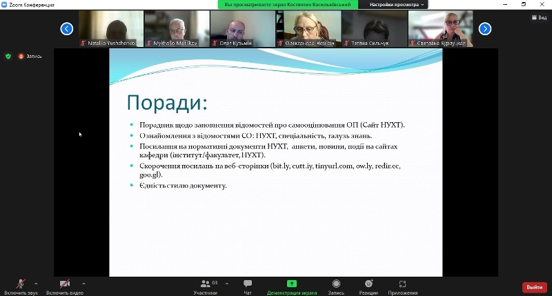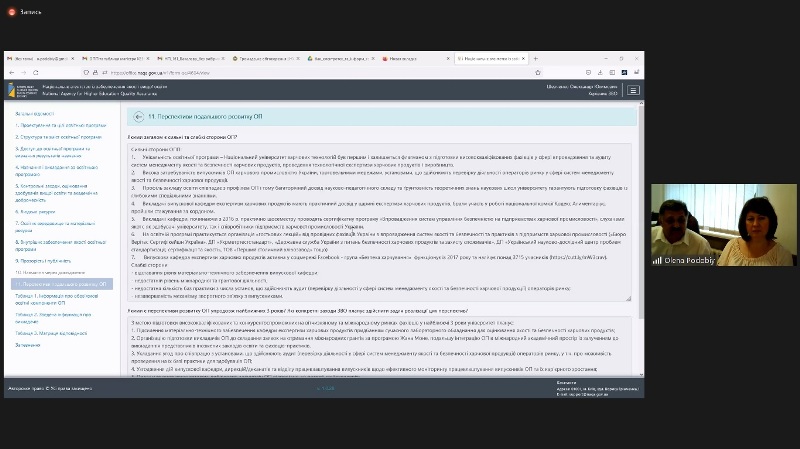 Відкрила тренінги директорка Центру моніторингу якості і координації освітньої діяльності НУХТ Олена Подобій. Вона також привітала учасників й проінформувала, що у цьому навчальному році успішно пройшли акредитацію 16 освітніх програм університету і одна з них – освітньо-наукова програма підготовки докторів філософії за спеціальністю «Біотехнологія» вперше в університеті акредитована з визначенням «зразкова». Також дві програми отримали умовну акредитацію на рік, через військову агресію проти нашої країни, що унеможливила роботу експертів НАЗЯВО. Фахівчиня привітала гарантів і всіх причетних із успішним проходженням акредитацій й подякувала за готовність поділитися своїм досвідом, оскільки дуже велика кількість освітньо-професійних і освітньо-наукових програм у наступному навчальному році включена до плану проходження акредитацій й роботу з їх підготовки необхідно починати вже зараз. І робити це краще, звичайно ж, врахувавши досвід колег.