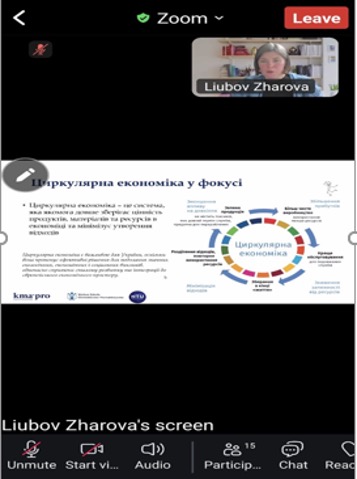 Лекторкою разом зі слухачами було розглянуто ключові положення державної стратегії розвитку циркулярної економіки, її узгодженість із політиками та директивами Європейського Союзу, а також виклики й перспективи впровадження принципів циркулярної економіки в Україні. Особливу увагу фахівчиня приділила питанням сталого розвитку, ефективного використання ресурсів, управління відходами та ролі бізнесу й освіти у трансформації економічної моделі.