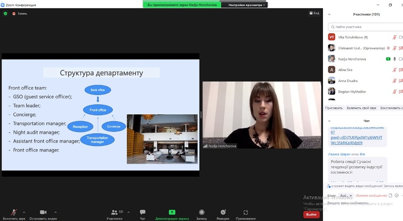 Після завершення пленарного засідання, конференція продовжила роботу у двох секціях – «Сучасні тенденції розвитку індустрії гостинності» під головуванням в.о. завідувачки кафедри готельно-ресторанної справи, доцентки, к. т. н. Лариси Шаран, в якій взяли учать понад 140 учасників, і «Сучасні тренди розвитку ресторанної індустрії» під головуванням завідувачки кафедри технології ресторанної і аюрведичної продукції, професорки, д. т. н. Олександри Нєміріч із 87 учасниками. Свої доповіді представили здобувачі освітніх ступенів «доктор філософії», «магістр», «бакалавр» нашого університету і закладів освіти України – Сумського національного аграрного університету, Львівського національного університету імені Івана Франка, Львівського державного університету фізичної культури імені Івана Боберського, Відокремленого структурного підрозділу «Вінницький фаховий коледж НУХТ», Відокремленого структурного підрозділу «Вінницький торговельно-економічний фаховий коледж КНТЕУ».