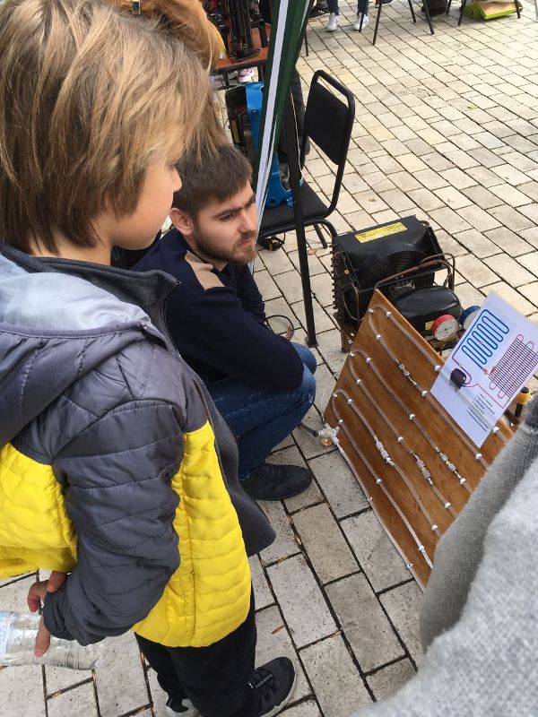 Відвідувачам нашої локації було запропоновано: ознайомитись із будовою поршневого та ротаційного компресора, спробувати визначити справний компресор, і здійснити його тестовий запуск, наживо побачити, що відбувається всередині випарника побутового холодильника, заморозити краплину води на напівпровідниковому термоелектричному модулі та за допомогою свічки і льоду виробити достатню кількість електроенергії для підсвічування абревіатури кафедри теплоенергетики та холодильної техніки – ТЕХТ, взяти участь у перегонах на робокарах.