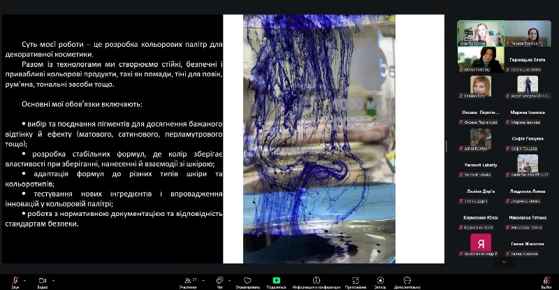 Нещодавно на запрошення гарантки бакалаврської освітньої програми «Хімічна технологія» («Хімічні технології косметичних продуктів та харчових добавок»), к.т.н., доцентки Олени Подобій до студентів спеціальності 161 (G1) «Хімічні технології та інженерія» з гостьовою онлайн-лекцією «Практичне застосування кольорових інгредієнтів в косметиці» завітала стейкхолдерка, фахівчиня косметичної галузі України Ірина Роговська.