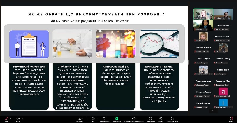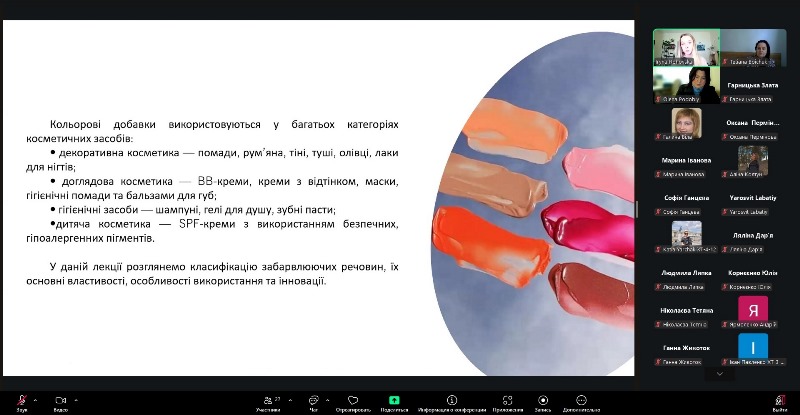 Особливо зацікавили слухачів наведені приклади використання барвників у косметичних продуктах – кремах для обличчя і тіла; гелях для вмивання/душу та шампунях; масках для обличчя/волосся; зубних пастах.