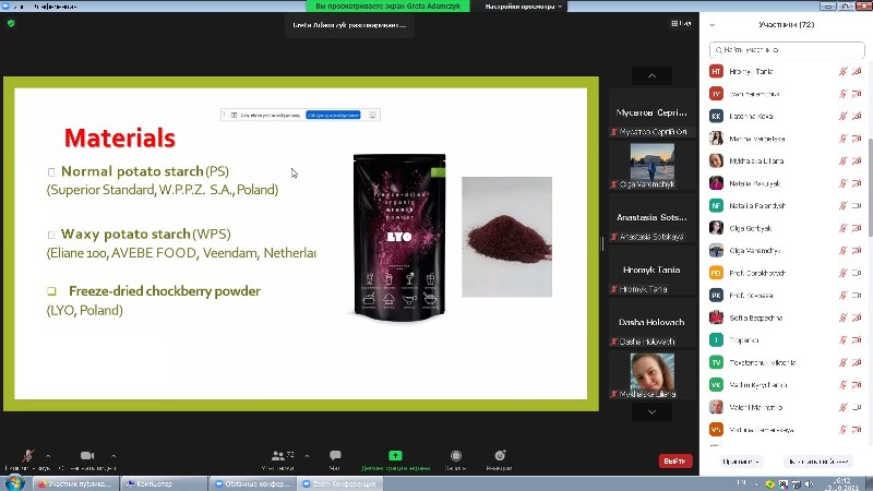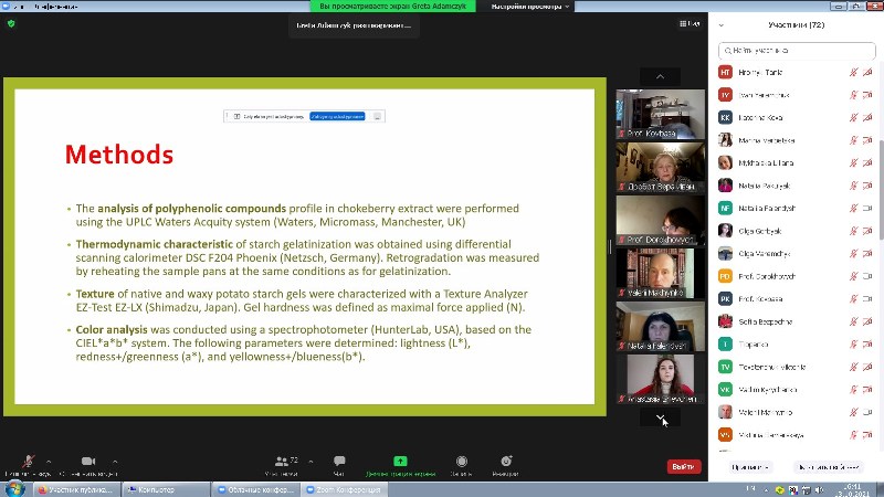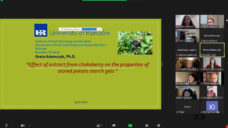 На кафедрі технології хлібопекарських і кондитерських виробів у онлайн-форматі відбулася гостьова лекція «Effect of extract from chokeberry on the properties of stored potato starch gels» доцентки Жешувського університету (Польща) Грети Адамчик для здобувачів освітнього ступеня «Магістр», освітніх програм «Технології хліба, кондитерських, макаронних виробів та харчоконцентратів» і «Технології органічних харчових продуктів» у рамках вивчення дисциплін «Інновації в технологіях борошняних, кондитерських виробів та харчоконцентратів», «Практичні проблеми в технологіях борошняних, кондитерських виробів та харчових концентратів» і «Основні принципи та вимоги до органічних харчових продуктів». До лекції також долучилися здобувачі вищої освіти освітнього ступеня «Бакалавр», освітньої програми «Харчові технології та інженерія», для яких інформація стала корисною в рамках вивчення дисципліни «Технології харчових концентратів».