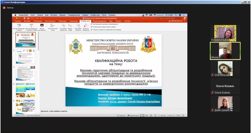 17 лютого відбувся захист комплексної міжкафедральної кваліфікаційної роботи здобувачів освітнього ступеня «Магістр» спеціальності 181 «Харчові технології», освітньо-професійних програм «Технології аюрведичних харчових продуктів», «Технології зберігання, консервування та переробки м’яса» та «Технології зберігання, консервування та переробки молока» факультету готельно-ресторанного та туристичного бізнесу імені проф. В.Ф. Доценка і Навчально-наукового інституту харчових технологій за загальною темою «Науково-практичне обґрунтування та розроблення технологій харчової продукції за аюрведичними рекомендаціями, адаптованої до українських традицій».