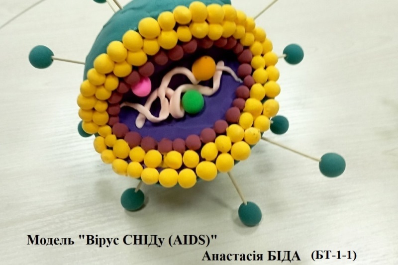 Об’ємну модель коронавірусу виготовила Марія Ненно (групаБТ-2-1). Це РНК-вмісний вірус із характерними шипами на поверхні, завдяки яким він і отримав назву «корона вірус». Саме ці шипи забезпечують прикріплення до чутливих клітин. Студентка відтворила його у спрощеному, але зрозумілому для кожного вигляді, адже саме з ним пов’язана пандемія, що змінила життя всього світу.
