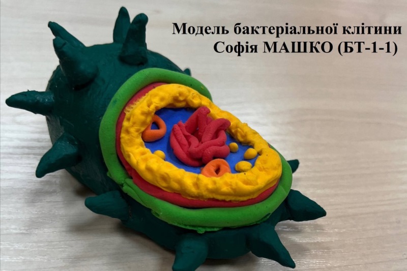 Анжеліка Цвілик (група БТ-2-2) виготовила об’ємну модель прокаріотичної клітини, яка демонструє основні частини бактеріальної клітини: клітинну стінку, цитоплазму, нуклеоїд, рибосоми, а також зовнішні структури – джгутики та війки, що забезпечують рух. Модель допомагає наочно продемонструвати будову прокаріотів і краще її запам’ятати.