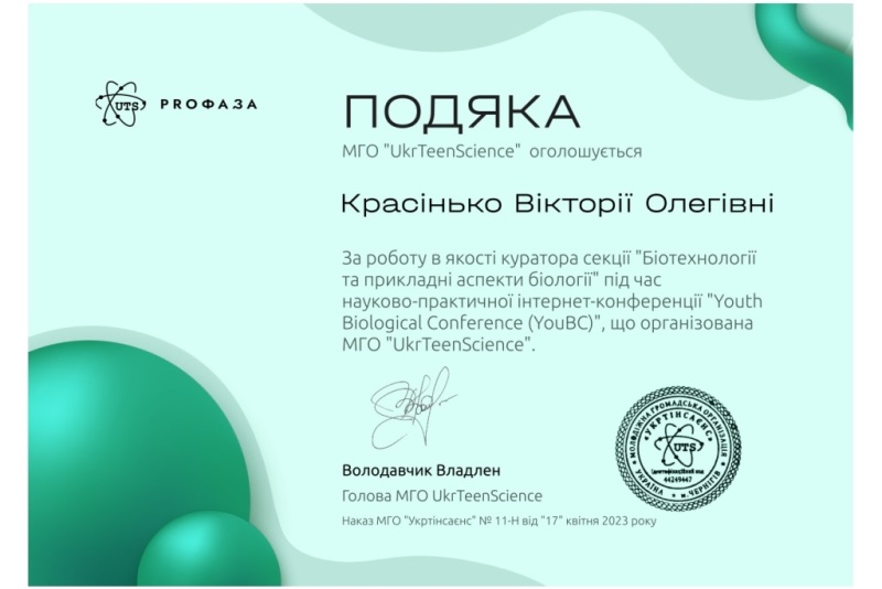 Нині, у надзвичайно важких умовах війни, як ніколи важливо не втратити науковий потенціал країни. Тому, розвиток наукового потенціалу молоді є сьогодні надважливим завданням. До підтримки молодих науковців долучилася нещодавно доцентка кафедри біотехнології і мікробіології Вікторія Красінько, яка на люб’язне запрошення молодіжної громадської організації UkrTeenScience взяла участь у науково-практичній інтернет-конференції «Youth Biological Conference» (YouBC) як куратор секції «Біотехнології та прикладні аспекти біології». Конференція була призначена для молодих дослідників і вчених, які працюють у сфері біології та біотехнології.