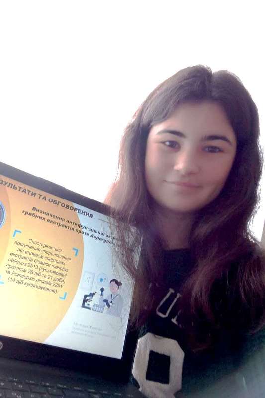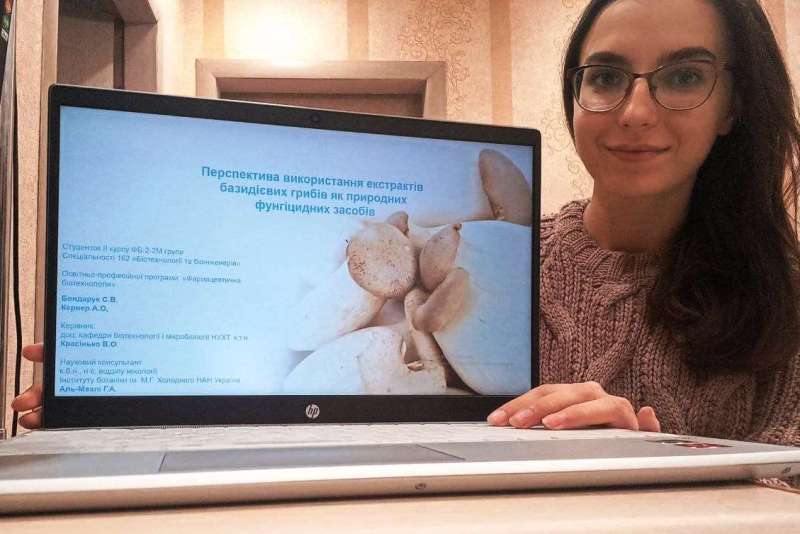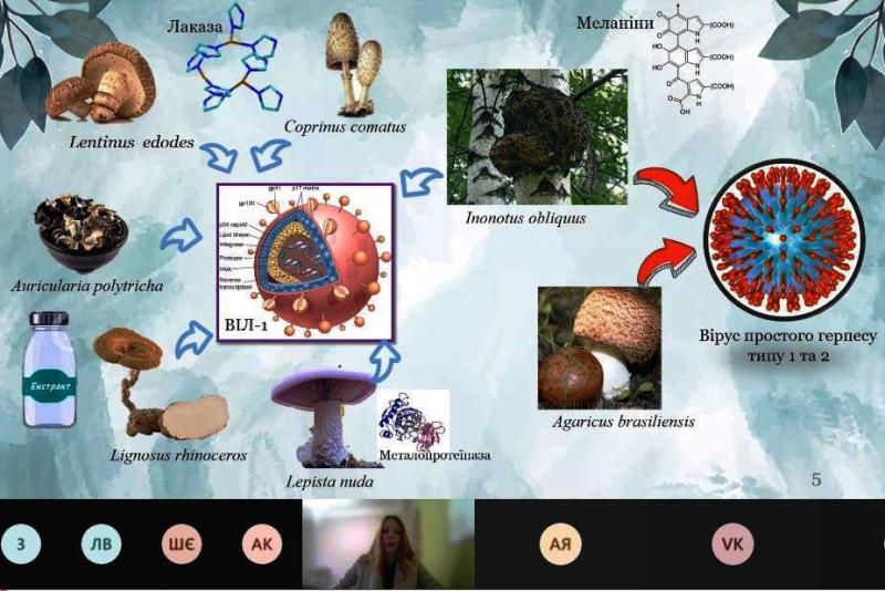 Наступною стала магістрантка І року навчання Владислава Лозіна, доповідь якої стосувалася теми «Антивірусна активність грибних метаболітів». За результатами наукової роботи Влада продемонструвала низку біологічно активних речовин, які можна використовувати для розроблення лікарських засобів, ефективних у лікуванні великої кількості вірусних захворювань, чим довела перспективність такого напрямку.