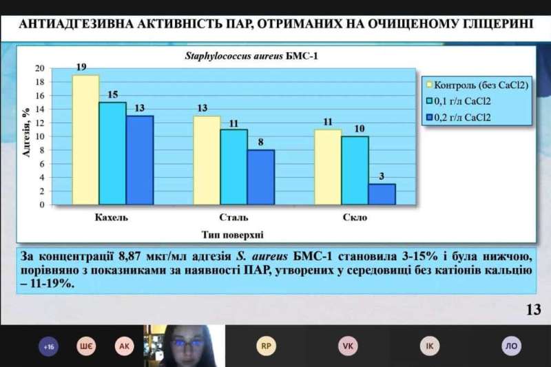 Своїми науковими здобутками також поділилася магістрантка ІІ року навчання Ганна Ярова у доповіді «Регуляція біологічної активності поверхнево-активних речовин, синтезованих Acinetobacter calcoaceticus ІМВ В-7241 на гліцерині». Результати наукової роботи нашої студентки настільки не залишили слухачів байдужими, що Ганна мала можливість відповісти на питання стосовно перспективності впровадження ПАР до фармацевтичної, хімічної галузі та медицини.