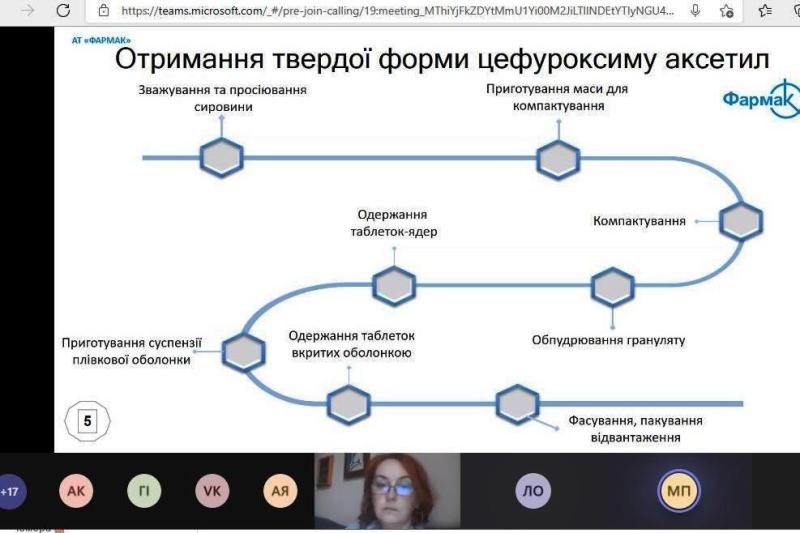 Завершив виступи науковців нашого університету магістрант-заочник ІІ року навчання Анатолій Міщук, який успішно поєднує навчання, виконання наукових досліджень і відповідальну роботу майстра АТ «Фармак». Разом зі студенткою Києво-Могилянської академії він підготував доповідь «Технологія виробництва твердої форми лікарського засобу з цефуроксиму аксетилом». Актуальністю теми стала потреба в антибіотиках широкого спектру дії, оскільки останнім часом у світі спостерігається загострення теми поширення інфекційних захворювань. Доповідачі запропонували технологічну схему виготовлення нового антибіотику, спираючись на можливість її впровадження на АТ «Фармак». Під час доповіді була відзначена доцільність такого виробництва та приведена низка нових технологічних рішень для забезпечення належної якості цільового продукту.