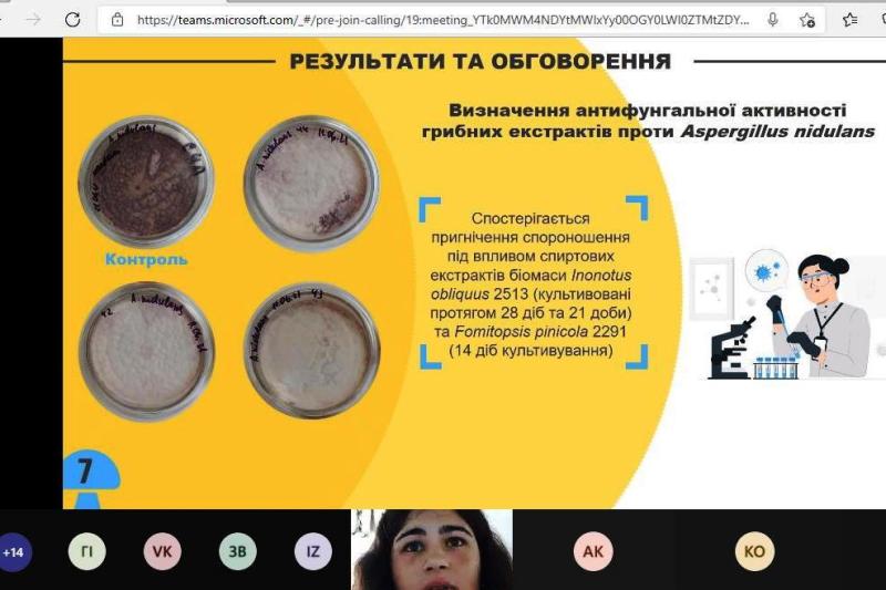 Наступними доповідачами від нашої кафедри стали магістрантки ІІ року навчання Аліна Кернер і Світлана Бондарук із доповіддю «Перспектива використання екстрактів базидієвих грибів як природних фунгіцидних засобів». У ході наукової роботи було визначено, що найбільшу активність проявляв екстракт трутовика соснового- Fomitopsis pinicola 2129. Після демонстрації та обговорення отриманих результатів, були відзначені широкі перспективи використання досліджуваних біологічно активних речовин як у фармації,так і в харчовій промисловості.
