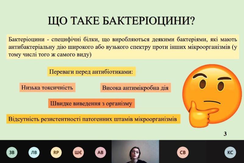 Далі від нашого університету свою доповідь «Бактеріоцини як альтернатива антибіотикам» представила магістрантка І року навчання Ірина Ковшар. Вона розглянула різні антимікробні білки та їх перспективність у розрізі проблеми антибіотикорезистентності. За сучасними поглядами такі речовини дійсно можуть замінити антибіотики, оскільки є більш безпечними та не викликають звикання. Також була зазначена можливість використання таких білків у лікуванні раку, оскільки деякі з них мають протипухлинну дію.