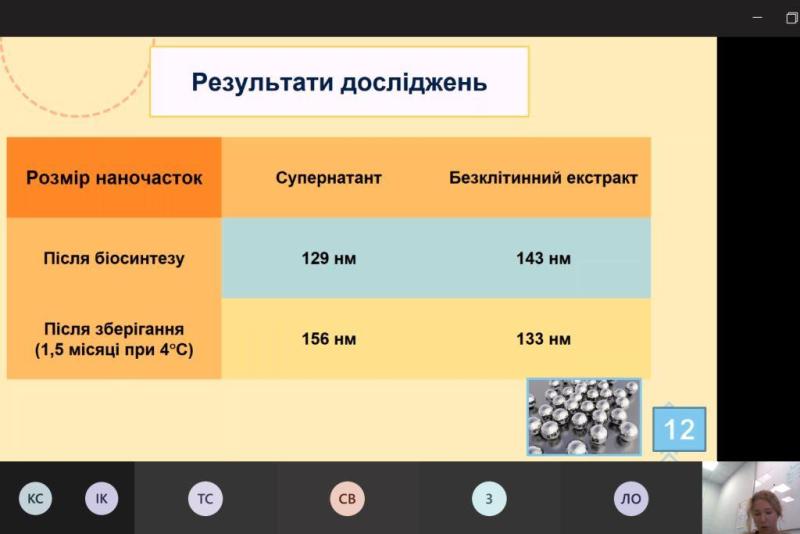 Після Дмитра доповідала магістрантка ІІ року навчання Юлія Лазюка, робота якої стосувалася біогенного синтезу наночасток срібла з використанням дріжджів. Науковиця відзначила ряд переваг біогенних наночасток порівняно з тими, що отримують за допомогою хімічних чи фізичних методів. Окреслила можливості біологічного способу синтезу наночасток срібла та перспективи їх застосування у медицині за рахунок високої антимікробної активності, зокрема антивірусної. У своїй роботі вона дослідила позаклітинний синтез наночасток срібла з використанням супернатанту культуральної рідини та безклітинного водного екстракту дріжджів, а також показала стабільність колоїдного розчину наночасток упродовж 45 діб зберігання.