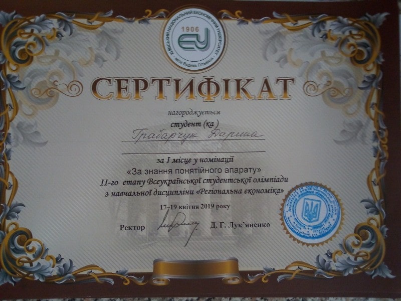 У період з лютого по квітень 2019 року відбулися І та ІІ тури Всеукраїнської студентської олімпіади з навчальної дисципліни «Регіональна економіка». З 17 по 19 квітня 2019 р. на базі ДВНЗ «Київський національний університет імені Вадима Гетьмана» відбувся ІІ етап, у якому брали участь наші другокурсниці спеціальності 051 «Економіка» (освітньо-професійна програма «Економіка підприємства») Дарина Грабарчук і Єлизавета Тушич.