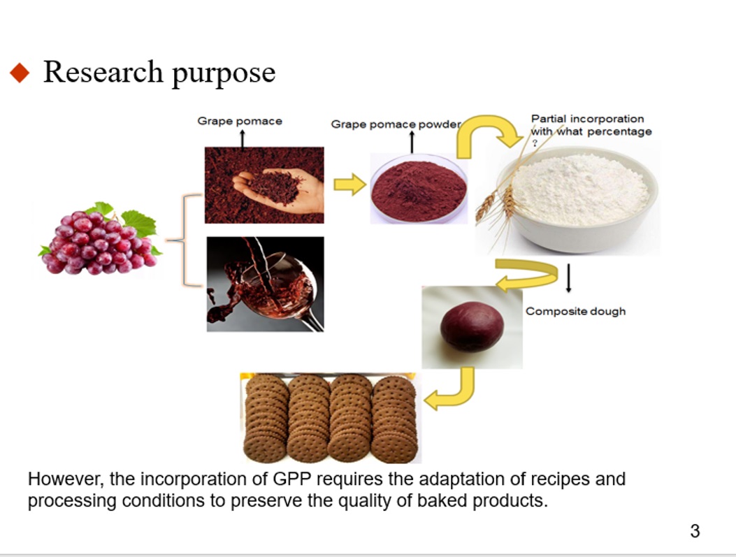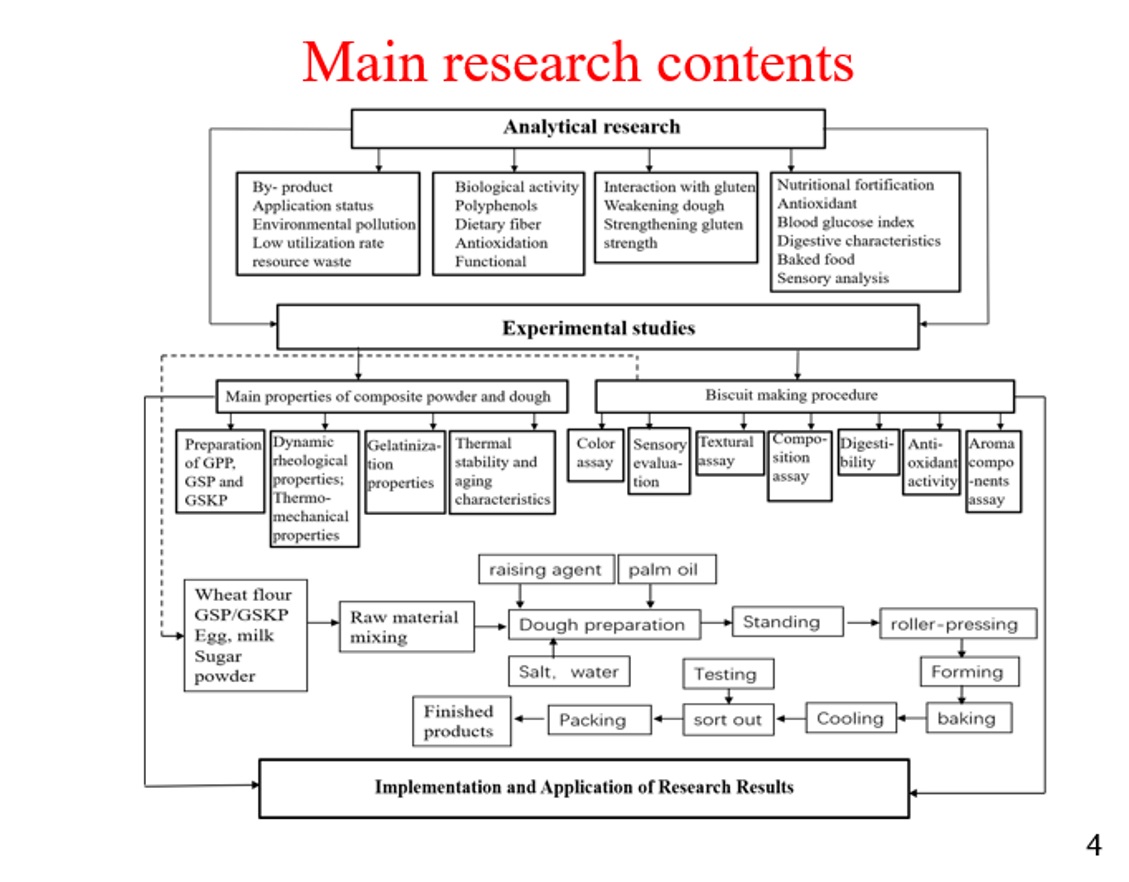 Дисертація «Розробка технології печива із додаванням порошків з виноградних вичавків» присвячена науковому обґрунтуванню та розробленню технології печива, збагаченого біологічно цінними речовинами за рахунок додавання порошків із виноградних вичавків, а також із кісточок і шкірочок, відокремлених із вичавків. Для виготовлення порошків використовували виноград сорту Каберне Совіньйон, вирощений у східній частині Китаю.