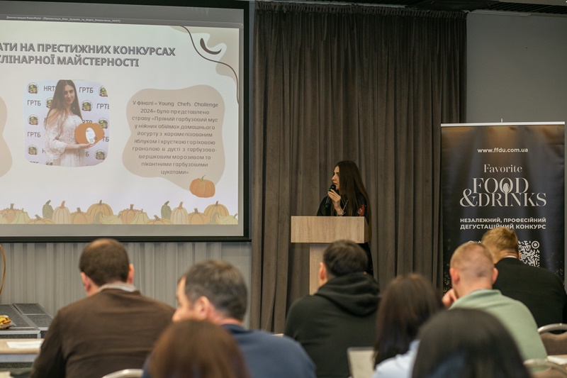 Команда університету виступила у першій секції, присвяченій бізнесу з перероблення, ринку, тенденціям та інноваційним можливостям розвитку індустрії, представивши результати наукових досліджень щодо інноваційних ресторанних страв із гарбуза та ферментованих напоїв на основі нетрадиційної рослинної сировини. Марія Омельченко провела дегустацію авторських експериментальних розробок, що є складовою теми її дисертаційного дослідження. Десерт викликав значний інтерес серед лідерів галузі й став показовим прикладом того, як сучасні наукові інновації трансформуються у практичні, ринково привабливі рішення та формують новий формат гастрономічної культури.