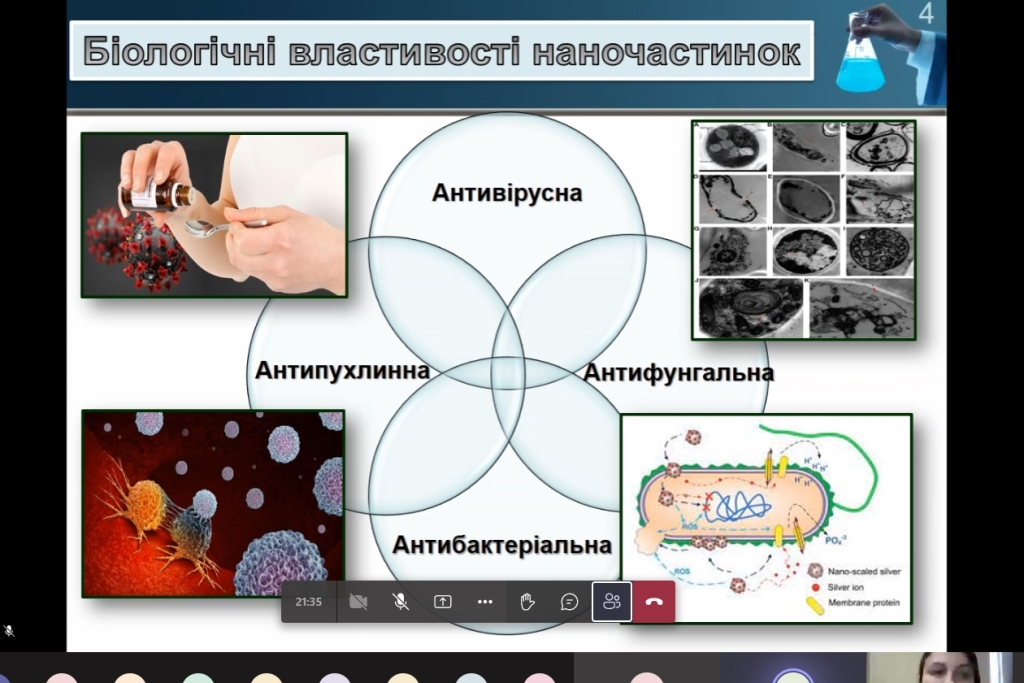 Валерія Потапенко та Ростислав Коваль представили доповідь щодо широкого використання наночастинок срібла (AgNPs) в медицині, способів їх отримання, а також притаманних їм властивостей. Так, AgNPs використовуються у противірусній терапії, у складі біосенсорів, як антимікробні засоби, як носії для адресної доставки ліків, у складі стоматологічних матеріалів і косметичних засобів, як покриття медичних виробів із нержавіючої сталі, як антигени та препарати генної терапії. Крім того, були висвітлені результати наукової роботи, де пошукачі отримували наночастинки срібла за допомогою дріжджів на базі лабораторій кафедри біотехнології і мікробіології.