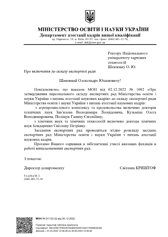 Згідно з наказом МОН від 02.12.2022 №1092 «Про затвердження персонального складу експертних рад Міністерства освіти і науки України з питань атестації наукових кадрів» до складу експертної ради Міністерства освіти і науки України з питань атестації наукових кадрів: