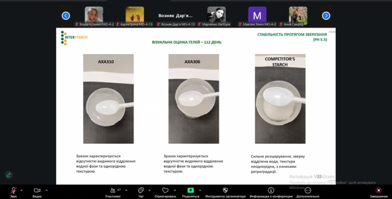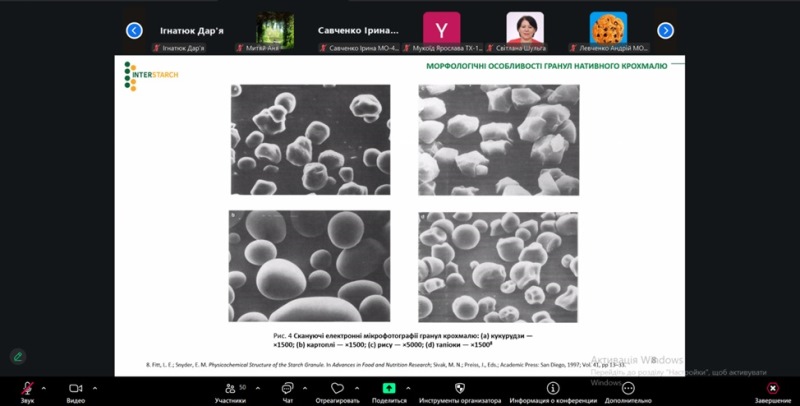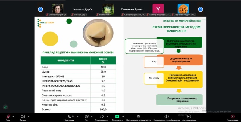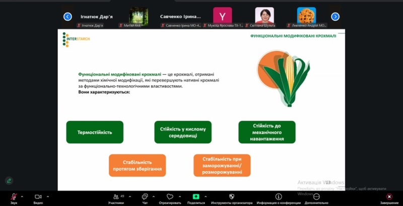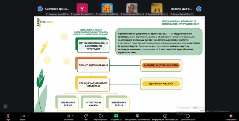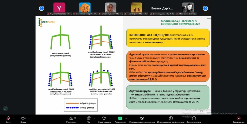 У перші дні грудня інженер-технолог компанії Interstarch Україна Артем Баралюк на запрошення директорки Навчально-наукового інституту харчових технологій Оксани Кочубей-Литвиненко прочитав онлайн-лекцію на тему «Застосування модифікованих крохмалів Interstarch в харчовій промисловості». Заявлена тематика зацікавила багатьох здобувачів спеціальності «Харчові технології», які навчаються у бакалавраті за освітньо-професійною програмою «Харчові технології та інженерія», та магістрантів освітніх програм «Технології зберігання, консервування та переробки молока», «Технології хліба, кондитерських, макаронних виробів та харчоконцентратів», «Технології органічних харчових продуктів», «Технології цукрів, полісахаридів і підготовки води в промислових та крафтових виробництвах».