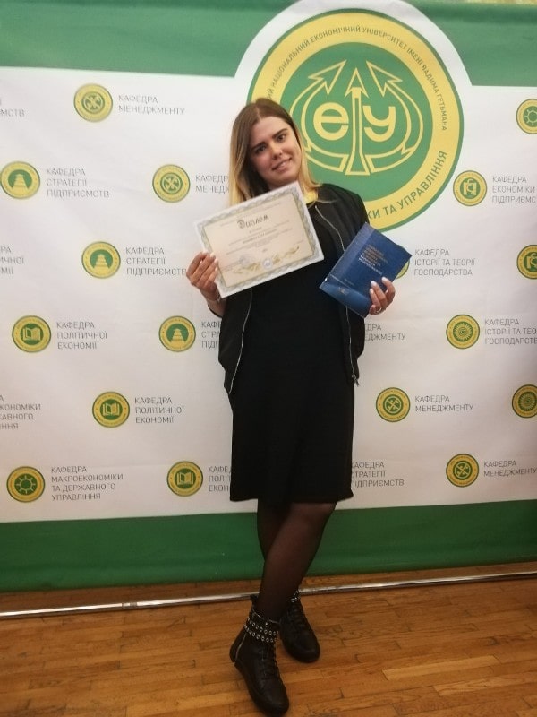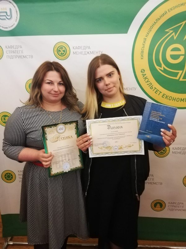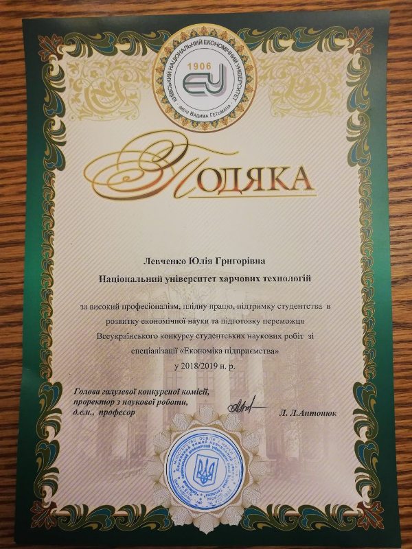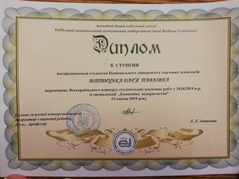 Приємно, що зусилля та праця Дар’ї не були марними, вона нагороджена Дипломом ІІ ступеня Всеукраїнського конкурсу студентських наукових робіт у 2018/2019 навчальному році зі спеціалізації «Економіка підприємства».