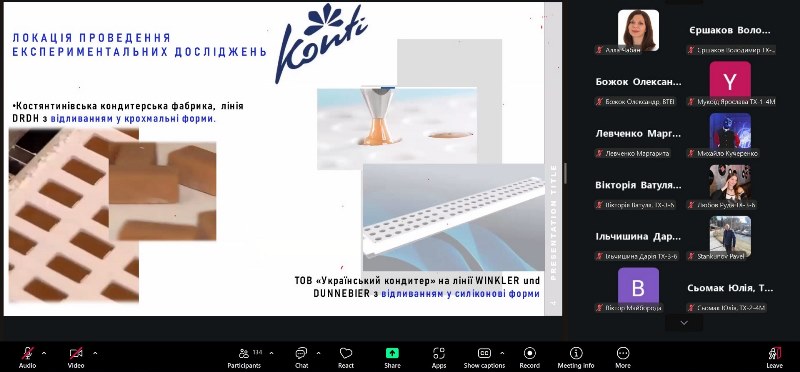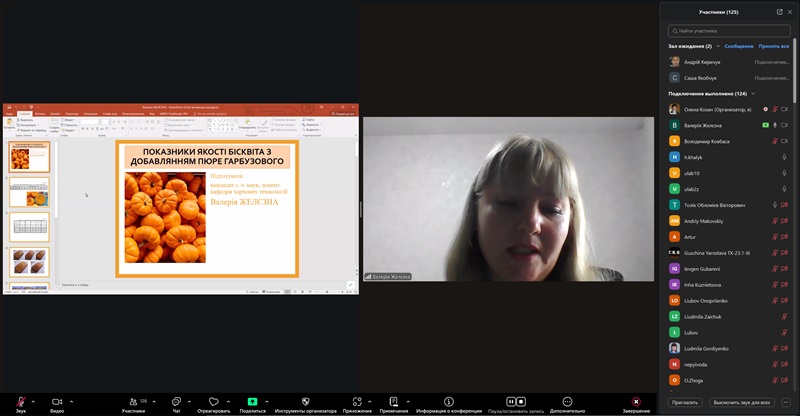 Як завжди у заході взяли участь колеги з провідних університетів України. Професорка кафедри технології зернопродуктів і кондитерських виробів Державного біотехнологічного університету Ольга Самохвалова та доцент кафедри обладнання та інжинірингу переробних і харчових виробництв цього ж університету Олексій Загорулько представили результати комплексного дослідження щодо отримання багатофункціональних рослинних паст та їх використання у технологіях пастило-мармеладних виробів. Про основні аспекти виробництва борошняних виробів для раціонального використання зернових ресурсів розповіла Ольга Макарова, доцентка кафедри технології зернових продуктів, хліба і кондитерських виробів Одеського національного технологічного університету. Доцентка кафедри харчових технологій Уманського національного університету Валерія Желєзна представила результати досліджень використання гарбузового пюре в технології бісквіту. Про особливості рецептурного складу та технології безглютенових кексів на основі концентрату сколотин учасники конференції дізналися під час доповіді Ольги Безрученко, старшої викладачки ВСП «Вінницький торговельно-економічний фаховий коледж ДТЕУ».