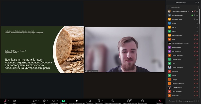 Завершив конференцію здобувач освітньо-наукового ступеня «доктор філософії» кафедри технології хлібопекарських і кондитерських виробів Андрій Ворвихвост із доповіддю, присвяченою дослідженню показників якості жорнового цільнозернового борошна різних культур із перспективою його застосування у технологіях борошняних кондитерських виробів.