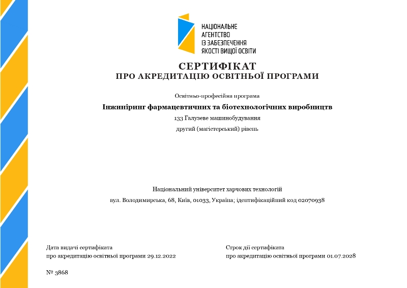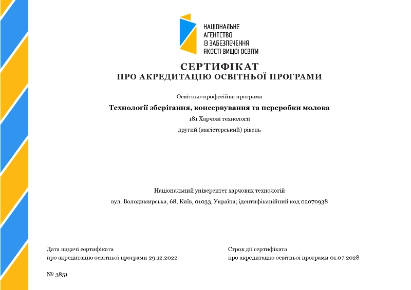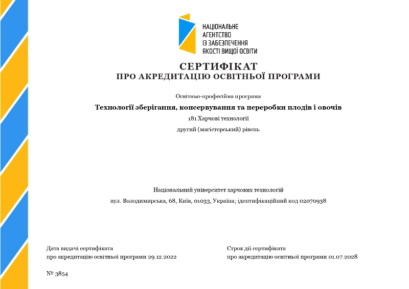 Приємний новорічний подарунок у вигляді сертифікатів про акредитацію отримали гаранти та робочі групи з розроблення освітніх програм Навчально-наукового інституту харчових технологій – «Технології продуктів бродіння і виноробства» (гарант – професор Віталій Прибильський, «Технології рослинних олій, жирових та косметичних продуктів» (гарантка – професорка Тамара Носенко), «Технології зберігання, консервування та переробки плодів і овочів» (гарант – професор Віталій Шутюк), «Технології зберігання, консервування та переробки молока» (гарантка – професорка Галина Поліщук), «Технології зберігання, консервування та переробки м'яса» (гарант – професор Василь Пасічний), «Технології харчових продуктів оздоровчого та профілактичного призначення» (гарантка – професорка Галина Сімахіна), «Технології харчових концентрованих продуктів на основі фруктово-овочевої сировини, чаю, кави та прянощів» (гарант – професор Олександр Бессараб), Навчально-наукового інженерно-технічного інституту ім. академіка І.С. Гулого – «Електротехнічні системи електроспоживання» (гарант – доцент Юрій Чорний), «Інжиніринг поліграфічних та пакувальних виробництв» (гарантка – доцентка Олена Чепелюк), «Інжиніринг фармацевтичних та біотехнологічних виробництв» (гарант – доцент Олексій Губеня), «Інжиніринг харчових виробництв» (гарант – професор Микола Якимчук) та Навчально-наукового інституту економіки і управління – «Менеджмент персоналу» (гарантка – доцентка Ліана Мазник), «Облік і аудит» (гарантка – доцентка Людмила Духновська) і «Фінанси, банківська справа та страхування» (гарантка – професорка Лада Шірінян).