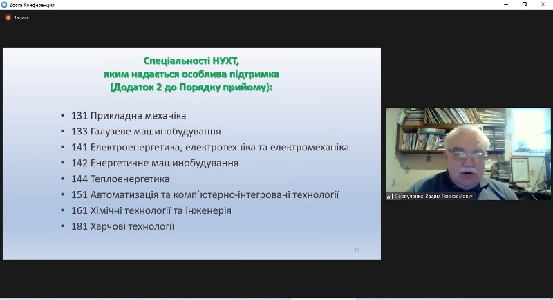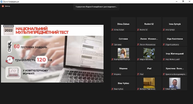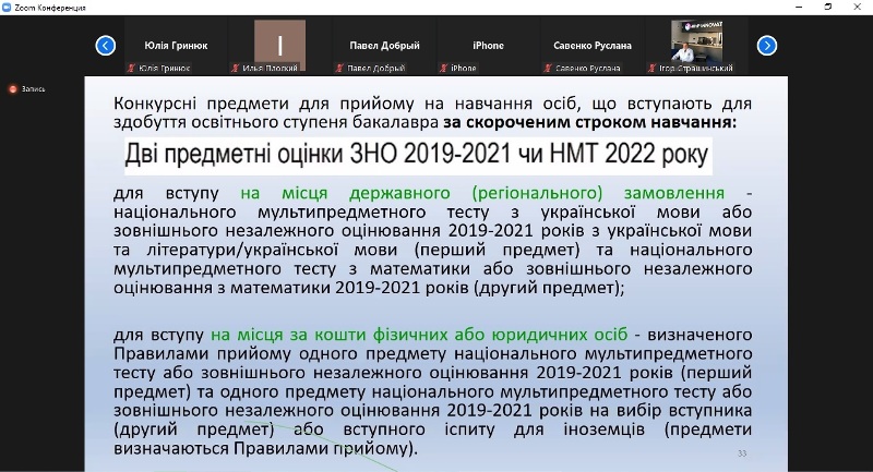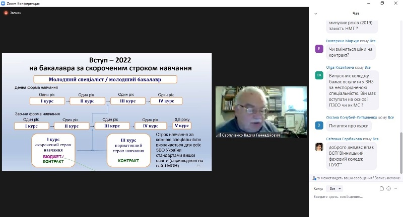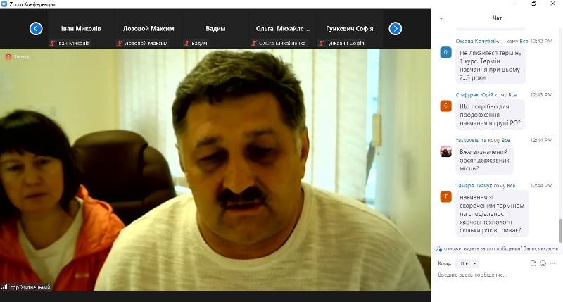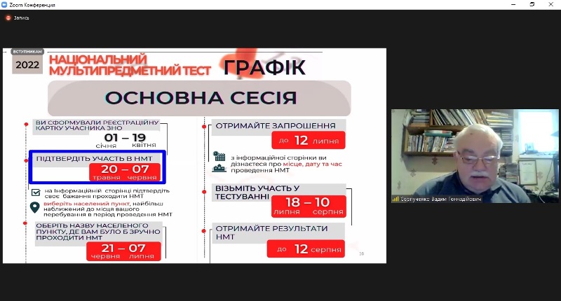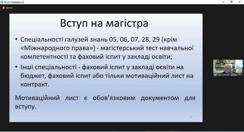 Наступна відеоконференція зібрала старшокурсників закладів фахової передвищої освіти. Вони також були докладно проінформовані щодо умов продовження здобуття вищої освіти. Відповідальний секретар приймальної комісії Вадим Серпученко і для них підготував ґрунтовну презентацію та надав роз’яснення щодо складання національного мультипредметного тесту, написання мотиваційного листа, реєстрації електронних кабінетів і подання документів. Окремо наш фахівець закцентував увагу присутніх на тому, що цього року вперше принцип «місце йде за вступником» застосовуватиметься і для цієї категорії вступників.