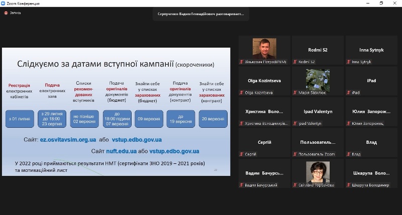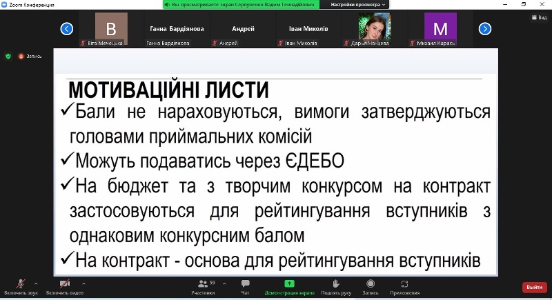 Зазначимо, що під час усіх трьох зустрічей відповідальний секретар приймальної комісії наголошував, що нинішня вступна кампанія, хоч і проходитиме в надзвичайно складних умовах невизначеності, спричинених військовою агресією проти нашої країни, буде організована з максимальним дотриманням заходів безпеки й безпрецедентною цифровізацією.