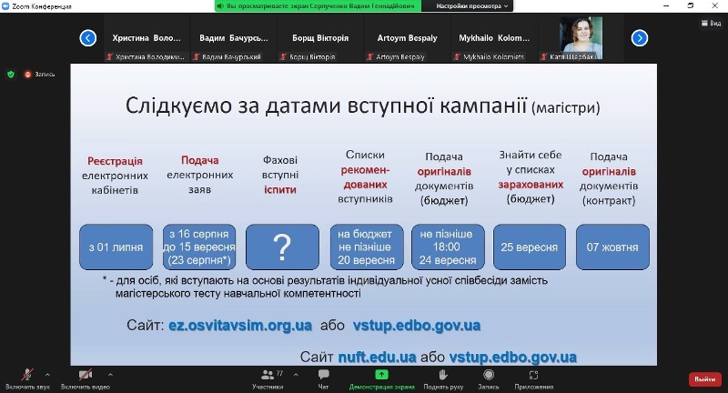 Сподіваємося, майбутні вступники отримали необхідну для себе інформацію. Ті ж, хто не зміг долучитися до зустрічі або мають бажання ще раз переглянути її, незабаром зможуть це зробити у архіві днів відкритих дверей на нашому сайті, де буде розміщений відеозапис.