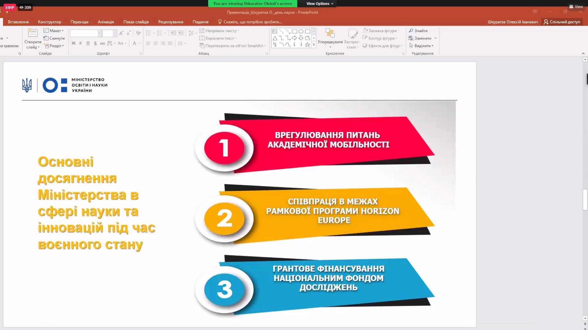 Заступник міністра освіти і науки України з питань європейської інтеграції Олексій Шкуратов доповідав про сучасний стан і виклики у сфері науково-технічної та інноваційної діяльності. Він наголосив, що основною проблемою у проведенні наукових досліджень є окупація наукових установ і закладів освіти російськими загарбниками, тимчасове переміщення науковців, обмежений доступ до обладнання, втрата наукової інформації тощо.