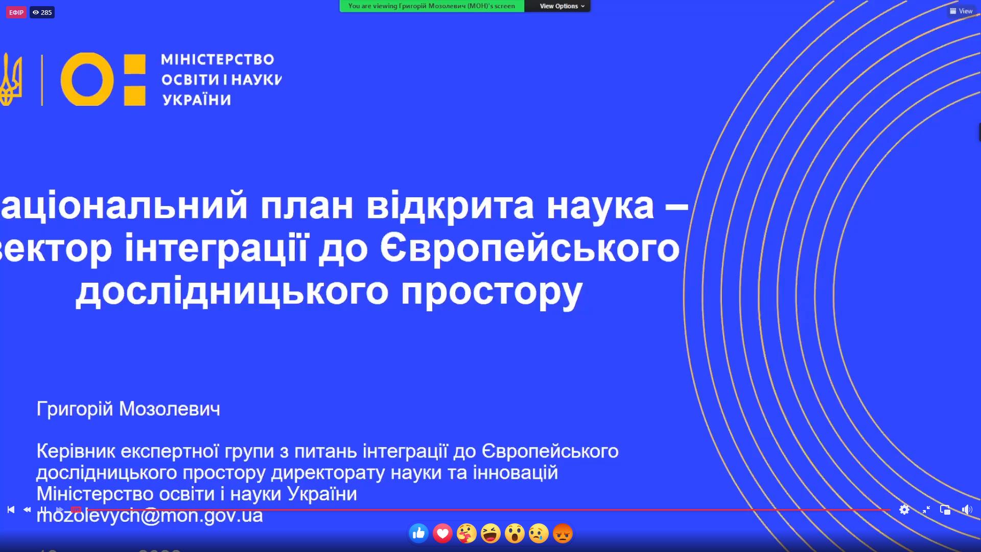 Від керівника експертної групи з питань інтеграції до Європейського Дослідницького Простору Міністерства освіти і науки України Григорія Мозолевича присутні дізналися про Національний план «Відкрита наука», що став вектором інтеграції до європейського дослідницького простору.