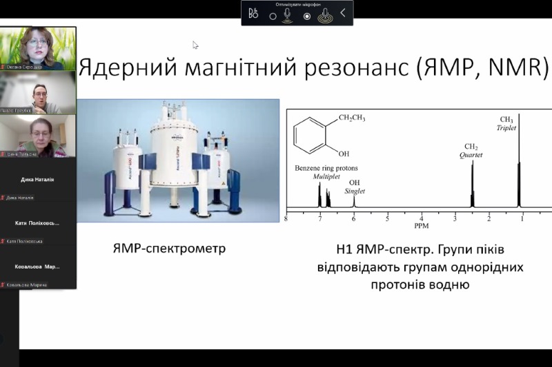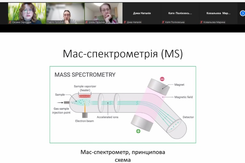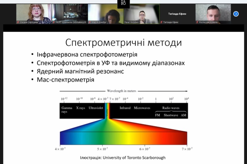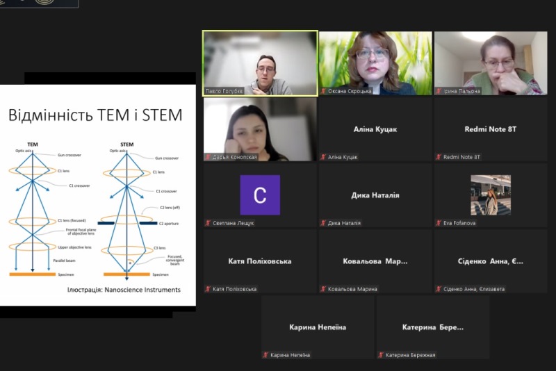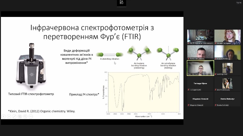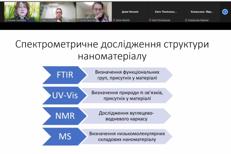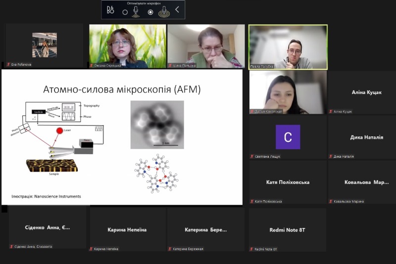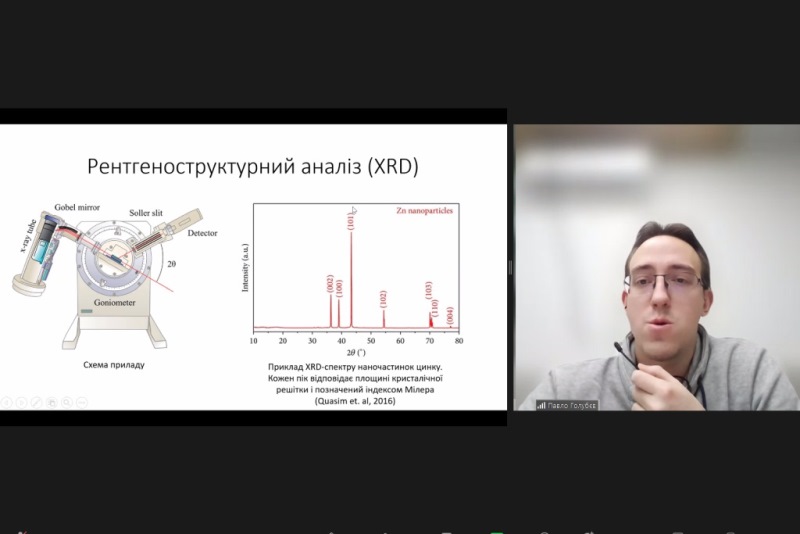 Лекція була присвячена методам контролю структурних і хімічних характеристик наноматеріалів: інфрачервоній та оптичній спектрофотометрії, рентгеноструктурному аналізу, методам мікроскопії високої роздільної здатності та іншим. Спектрофотометричні методи – найпростіші для виконання, але дуже інформативні для дослідника. Оптична спектрофотометрія в ультрафіолетовому та видимому діапазонах полягає у вимірюванні поглинання світла зразком та аналізі змін у спектрі, що виникають внаслідок цього поглинання для отримання інформації про властивості та склад досліджуваного зразка. Інфрачервона спектрофотометрія дозволяє встановити наявність певних молекулярних груп у структурі наноматеріалів завдяки поглинанню ІЧ-променів молекулами зразка з певними частотами, що відповідають їхнім вібраційним та коливальним рухам. Дифракційні методи та методи розсіювання дозволяють визначити інші структурні властивості: так рентгеноструктурний аналіз дає інформацію про кристалічні структури у складі наноматеріалів завдяки заломленню рентгенівських променів, а лазерна дифракція та динамічне світлорозсіювання дозволяють одержати інформацію про розподіл розмірів наночастинок. Методи електронної та атомно-силової мікроскопії дозволяють побачити об’єкти значно менші за довжину хвилі видимого світла. Сучасні атомно-силові мікроскопи фіксують навіть хімічні зв’язки між атомами.