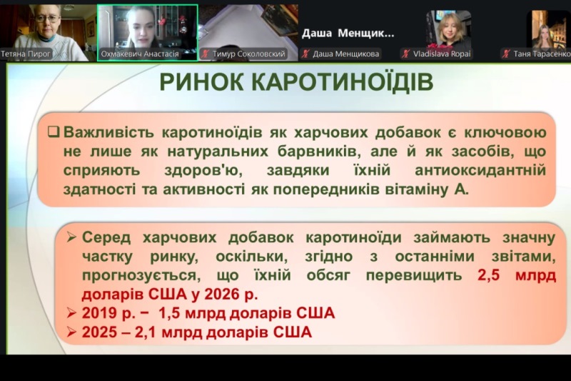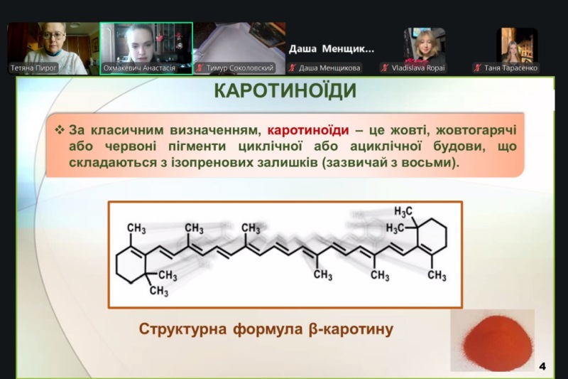 Лабораторне заняття проходило у формі активного обміну думками між практиканткою, здобувачами та викладачкою. На початку заняття було розглянуто основні теоретичні відомості: структурні формули бета-каротину, лікопіну та астаксантину, їхні властивості, застосування у промисловості, природні та удосконалені продуценти каротиноїдів, вплив умов культивування дріжджів R. glutinis на біосинтез каротиноїдів. Під час обговорення практичної частини роботи увага приділялася принципам поділу компонентів поживного середовища на композиції, підготовці робочої культури R. glutinis шляхом посіву до ізольованих колоній, а також посівного матеріалу продуцента бета-каротину. На завершення заняття Анастасія роз’яснила порядок виконання наступного пошукового індивідуального завдання для здобувачів освіти та доброзичливо надала відповіді на запитання.