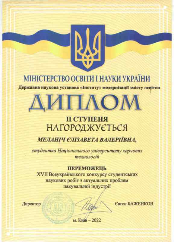 У номінації «Технологія та обладнання для виготовлення пакувальних матеріалів та упаковки» друге місце посіла й була нагороджена дипломом ІІ ступеня Ольга Степанова за конкурсну роботу «Розробка конструкції та технології виготовлення картонної споживчої упаковки для стаканчиків із йогуртом».