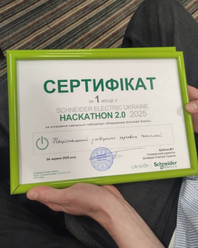 4 червня відбувся Всеукраїнський технічний хакатон, організований компанією Schneider Electric Україна, що зібрав команди з 15 провідних технічних університетів країни, загалом близько 150 учасників. Честь нашого університету захищали вихованці кафедри автоматизації та комп'ютерних технологій систем управління ім. проф. А.П. Ладанюка – третьокурсник бакалаврату Олексій Григорович і магістрант Олександр Козирєв.