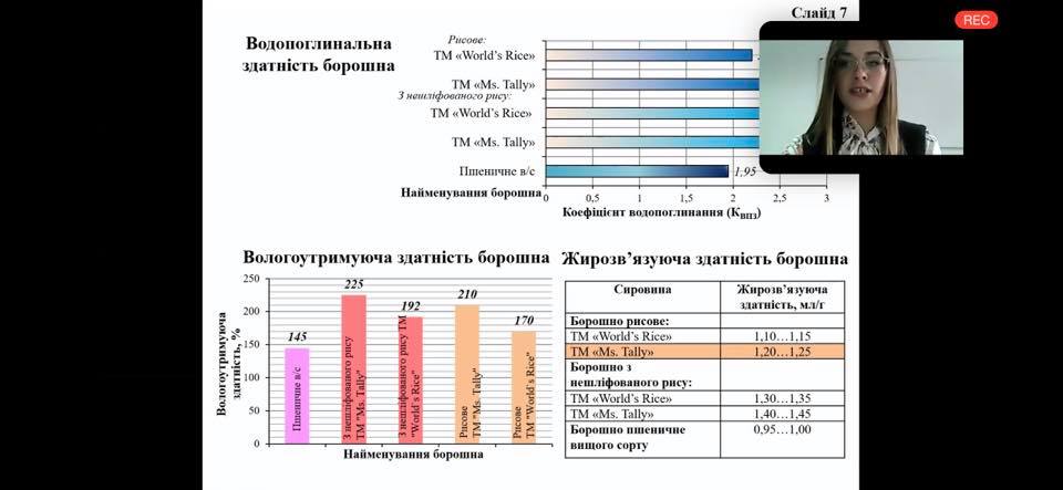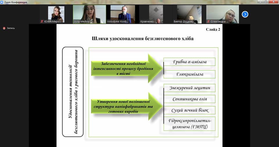 Ірина Медвідь представила результати наукових досліджень із обґрунтування та удосконалення технології безглютенового хліба з рисового борошна з використанням амілолітичних ферментів і структуроутворювачів. У дисертаційній роботі здобувачем доведена доцільність спільного використання знежиреного лецитину, соняшникової олії і як структуроутворювачів – сухого яєчного білка та ГПМЦ у рецептурній композиції удосконаленого безглютенового хліба в поєднанні зі ферментативною модифікацією крохмалю рисового борошна.