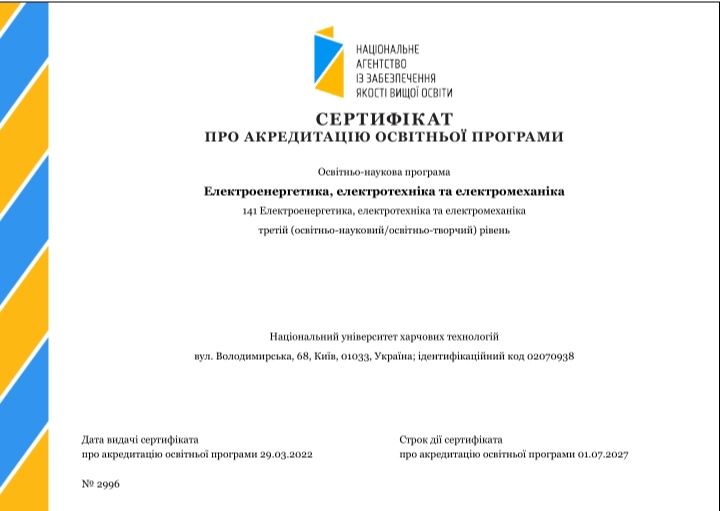 Через військову агресію з боку росії, розгляд акредитацйних справ Національним агентством із забезпечення якості вищої освіти був відтермінований. Засідання, на якому була розглянута акредитаційна справа нашої освітньо-наукової програми, відбулося 1 березня. Усі 17 членів НАЗЯВО, присутніх на засіданні, проголосували за надання акредитації освітньо-науковій програмі «Електроенергетика, електротехніка та електромеханіка» підготовки здобувачів за третім рівнем вищої освіти терміном на п’ять років. Наразі університет отримав і відповідний сертифікат.